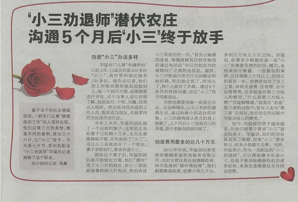 采访核心人物:小三劝退分离名师、江苏婚姻家事咨询研究专家、婚姻分析情感导师、婚姻危情干预专家、出轨挽回形式的挽救婚姻家庭情感心理及爱情挽回计策『现实版分手大师线下实操实地执行劝退小三分离第三者』保家卫婚业界名人、原千里眼名机构特聘调查研究专家『商业名侦探』指导顾问、官政媒体称之为:华探『商业调查师』华先生。